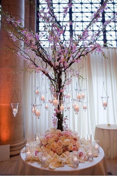 Декор может быть любым – зеленые, неотличимые от живых, деревья, ветви, припорошенные инеем, цветущие или покрытые только открывающимися почками, и более футуристические конструкции.